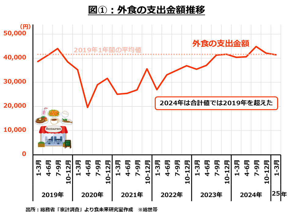 まずは外食の支出金額について、コロナ禍前の2019年からの推移を見てみます。