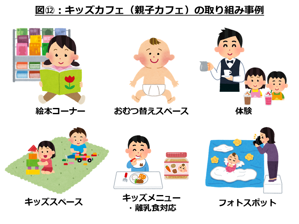 また、カフェ+αの取り組みも様々なものが見られました。本屋とカフェのコラボであったり、いくつかのカフェチェーン店では昼間はカフェ夜はお酒の二毛作の店舗を出したりと、数年前から見られた取り組みが徐々に拡大、浸透していっているのではないかと思われます。 カフェの親子利用も人気です。大手企業では絵本スペースを設置したカフェの店舗が2019年比で約3倍に増加するなど、子どもと利用しやすいカフェが増加しているようです。子ども連れ外食は中々ゆっくり出来ないけど、たまには外でゆっくり楽しみたい!と私自身も何度も思ったことがあります。カフェは一人利用が多いイメージですが、前述のような方々の新しい利用につながっているのかもしれません。絵本スペース以外にも全国で様々な取り組みをされています。