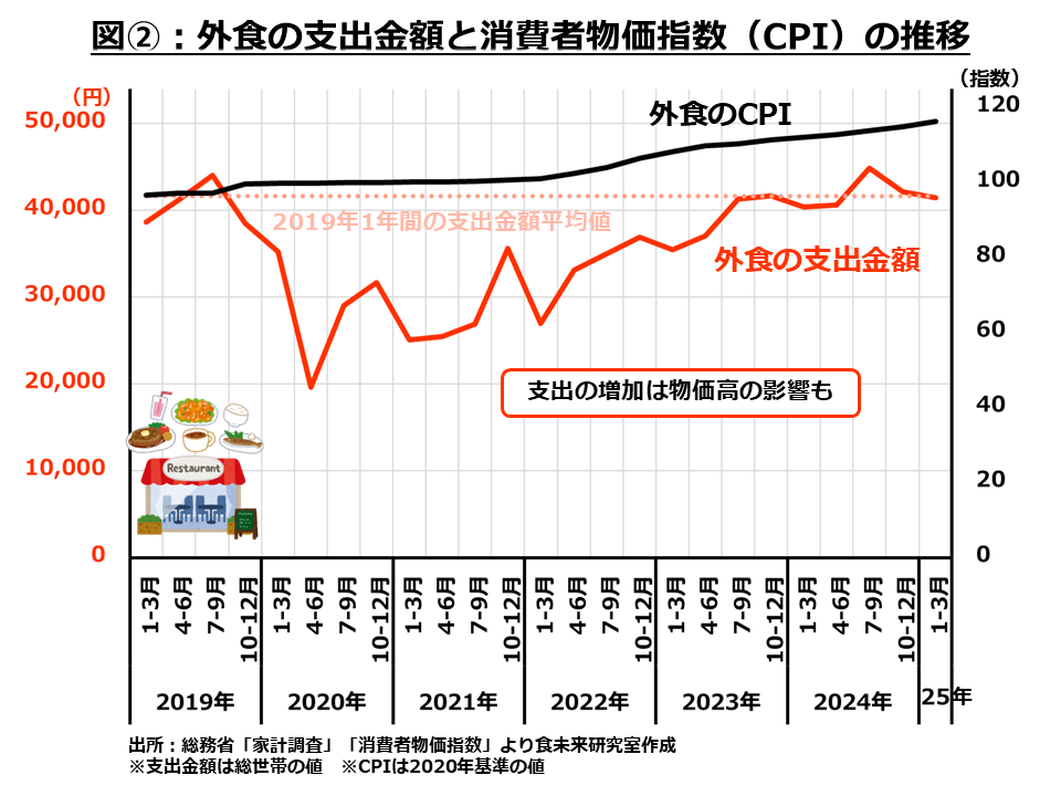 こちらは、図①に外食の消費者物価指数(CPI)を重ねたグラフです。CPIという指標は前回の記事でも使用しましたが、物価の指標となる値であり、この数値の流れをみることにより物価の上がり下がりを把握することが出来ます。このCPIをみると、2022年頃から上昇してきており、支出の増加は物価高の影響も受けていると考えることが出来ます。それを考慮すると、外食の客足はまだ戻り切っていないと言えるでしょう。