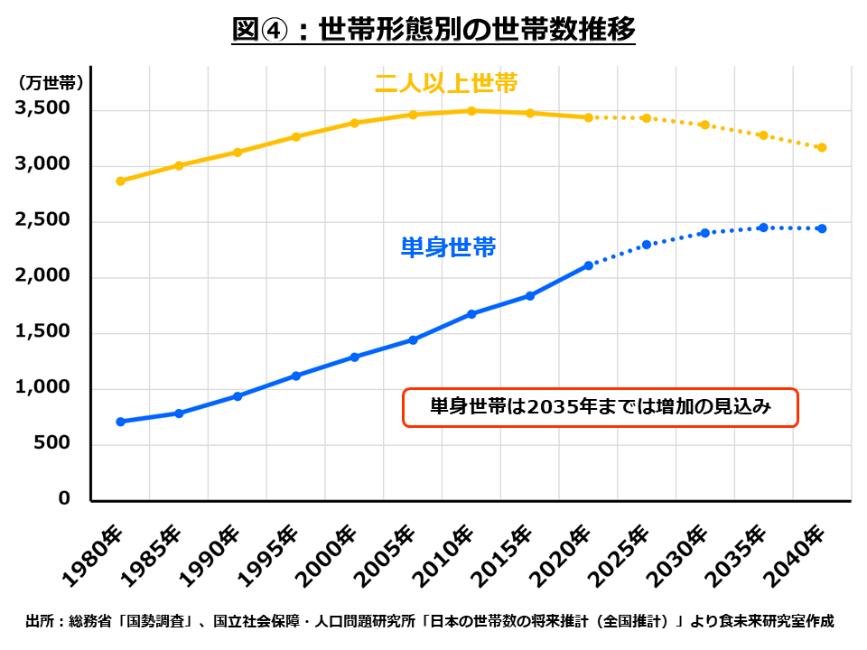 世帯形態別の世帯数の変化をみると単身世帯のみ増加しており、10年後の2035年頃までは増加が続く見込みとなっています。すでに減少傾向となっている2人以上世帯とは逆にしばらくは増加傾向の市場となっているので、しっかりと押さえておきたいターゲットです。