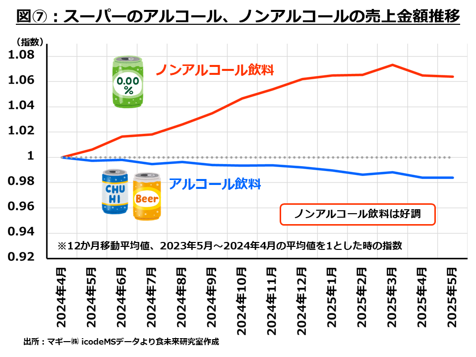 図⑦はスーパーマーケットのアルコール類の売上金額の変化になります。アルコール飲料は全体的に減少傾向となっていますが、ノンアルコール飲料は好調に推移しています。外食店での単身世帯のノンアルコール利用も増えており、ここにチャンスがあるのではないかと考えられます。