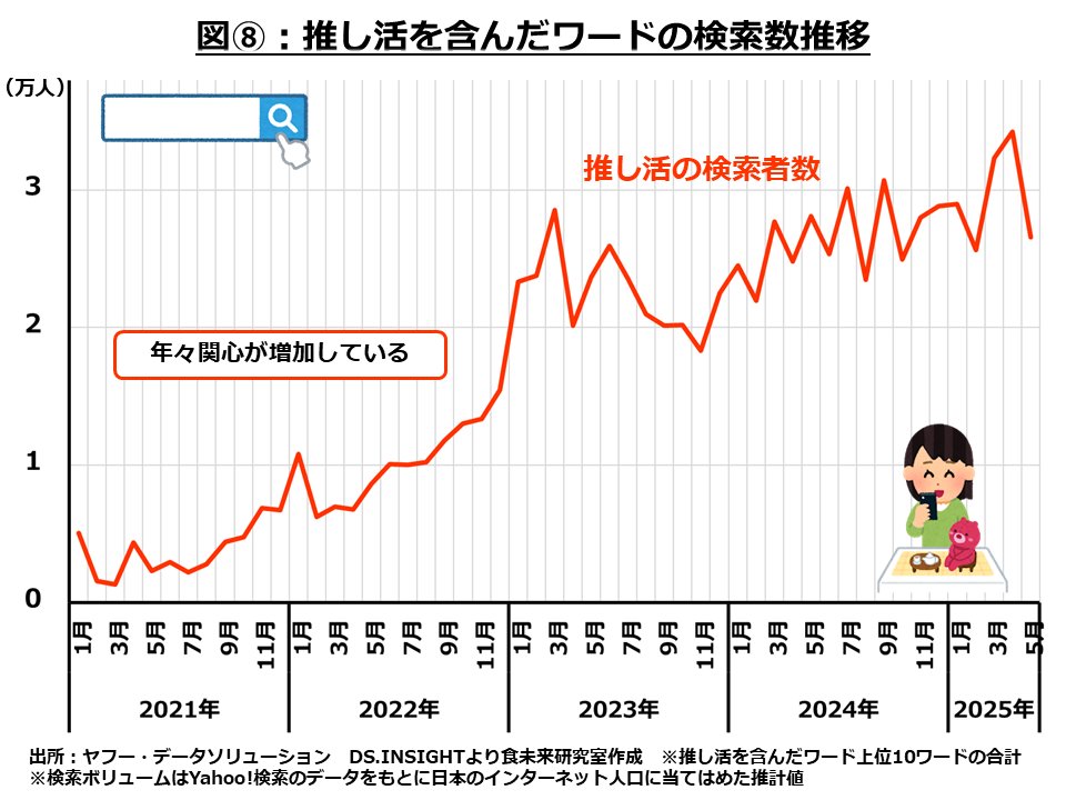 こちらは推し活を含んだワードの検索者数の推移をあらわしており、年々増加しているのが分かります。推しのメンバーカラーと同じ色のドリンクの写真や、人形とドリンクや料理を一緒に撮影したりする光景はメディアで見る機会も多いのではないでしょうか。推し活を推奨することで人気となっている飲食店もあるようです。写真・動画映え、SNS映えするようなメニュー展開も新しいお客さまを呼び込む施策の一つです。