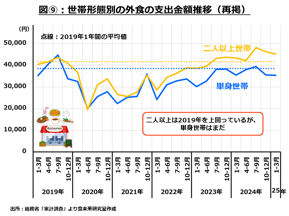 こちらは、世帯形態別に外食の支出金額の変化を見たグラフです。このグラフを見ると、世帯形態により状況が異なっており、二人以上世帯は2019年を超えていますが、単身世帯は2023年後半から停滞気味です。
